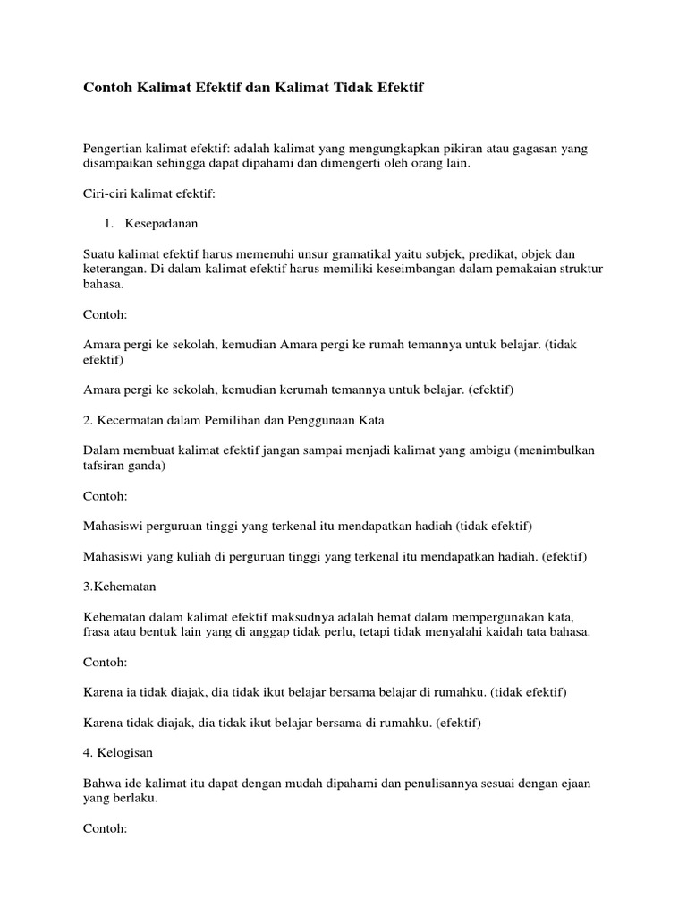 Ciri Ciri Kalimat Efektif Dan Tidak Efektif : Https Pdfcoffee Com Download Kalimat Efektif 1 3 Pdf Free Html - Ketahui apa it kalimat efektif dari pengertian, ciri dan unsur dilengkapi contoh dan pembahasannya menurut para ahli (buku referensi terlampir).. Penggunaan kalimat tidak efektif seperti contoh di atas bisa menimbulkan salah paham. Kali ini mari kita bahas mengenai pengertian kalimat efektif, ciri ciri kalimat efektif, syarat kalimat efektif, contoh kalimat efektif dan tidak efektif. Memiliki dua konjungsi pada suatu kalimat yang memiliki dua klausa. Karena itu, buatlah kalimat dengan ide yang mudah dimengerti dan masuk akal agar pembaca dapat dengan mudah. Memiliki unsur kalimat yang jelas, minimal subjek dan predikat.